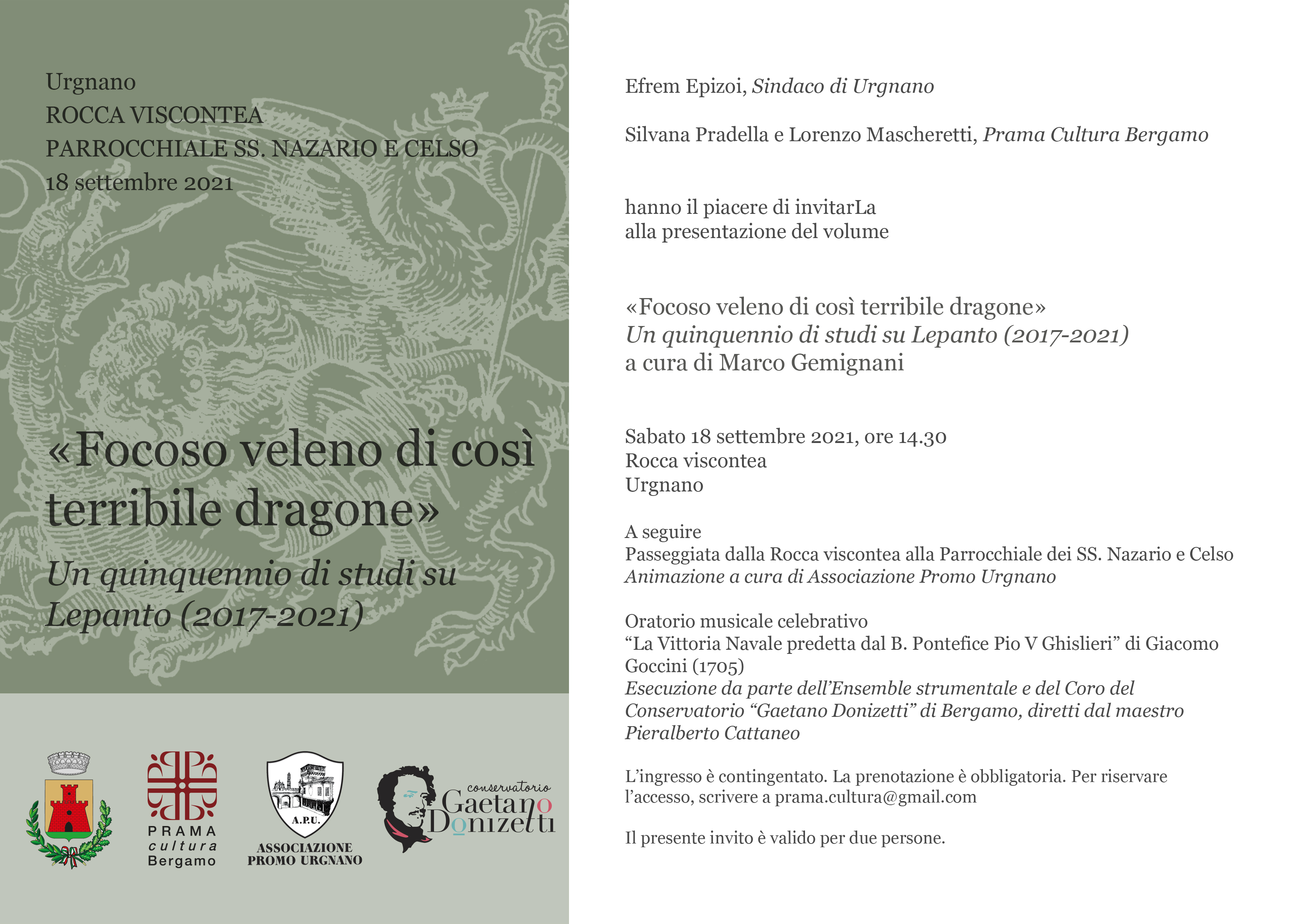 In occasione del 450esimo Anniversario della "Battaglia di Lepanto: 1571-2021", Prama Cultura Bergamo in collaborazione con il Conservatorio "Gaetano Donizetti" di Bergamo, organizza la Prima Esecuzione Moderna in Lombardia dell'Oratorio Celebrativo posto in Musica nel 1705 da Giacomo Goccini, Accademico Filarmonico che fu Maestro di Cappella in S.Maria Maggiore ( Bg.) per 28 anni, dal 1717 fino al 1745.