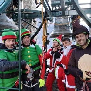 Dal campanile della chiesa di Valbondione, dimostrazione di soccorso alpino a cui parteciperanno anche... elfi, renne e babbo natale!