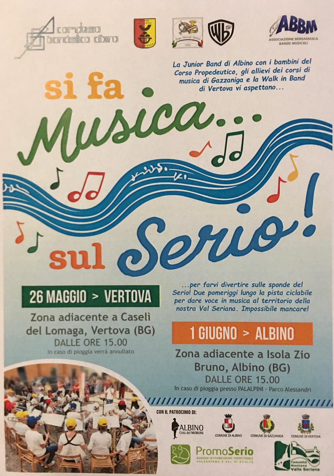 La Junior Band di Albino con i bambini del Corso Propedeutico, gli allievi dei corsi di musica di Gazzaniga e la Walk in Band di Vertova vi aspettano per farvi divertire sulle sponde del Serio! Un pomeriggio per dar voce al territorio della ValSeriana.