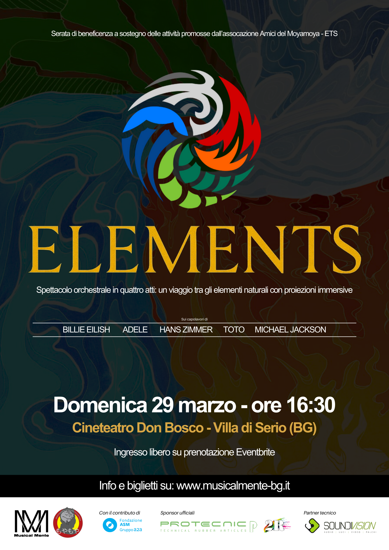 L’ orchestra Soundblast presenta ELEMENTS: un viaggio immersivo in quattro atti dove musica, immagini e poesia si fondono per dare voce ai quattro elementi naturali — terra, acqua, fuoco e aria. Ogni atto è un’esperienza sensoriale unica: un dialogo tra suoni, luci e immagini che trasforma il palco in un universo in continuo mutamento.