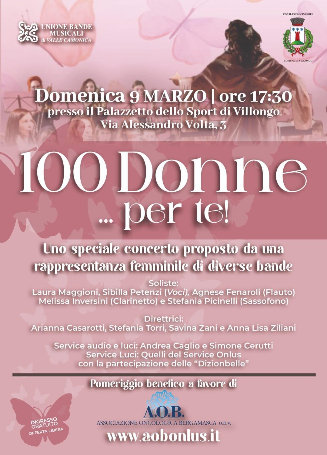 Domenica 9 marzo, alle ore 17:30, il Palazzetto dello Sport di Villongo (Via Alessandro Volta, 3) ospiterà un evento straordinario a sostegno della Mission AOB, l'Associazione Oncologica Bergamasca impegnata nella lotta contro il tumore. Un concerto benefico unico, in cui un'orchestra tutta al femminile, composta da ben 100 donne strumentiste, si esibirà sotto la direzione di quattro Maestre eccezionali.