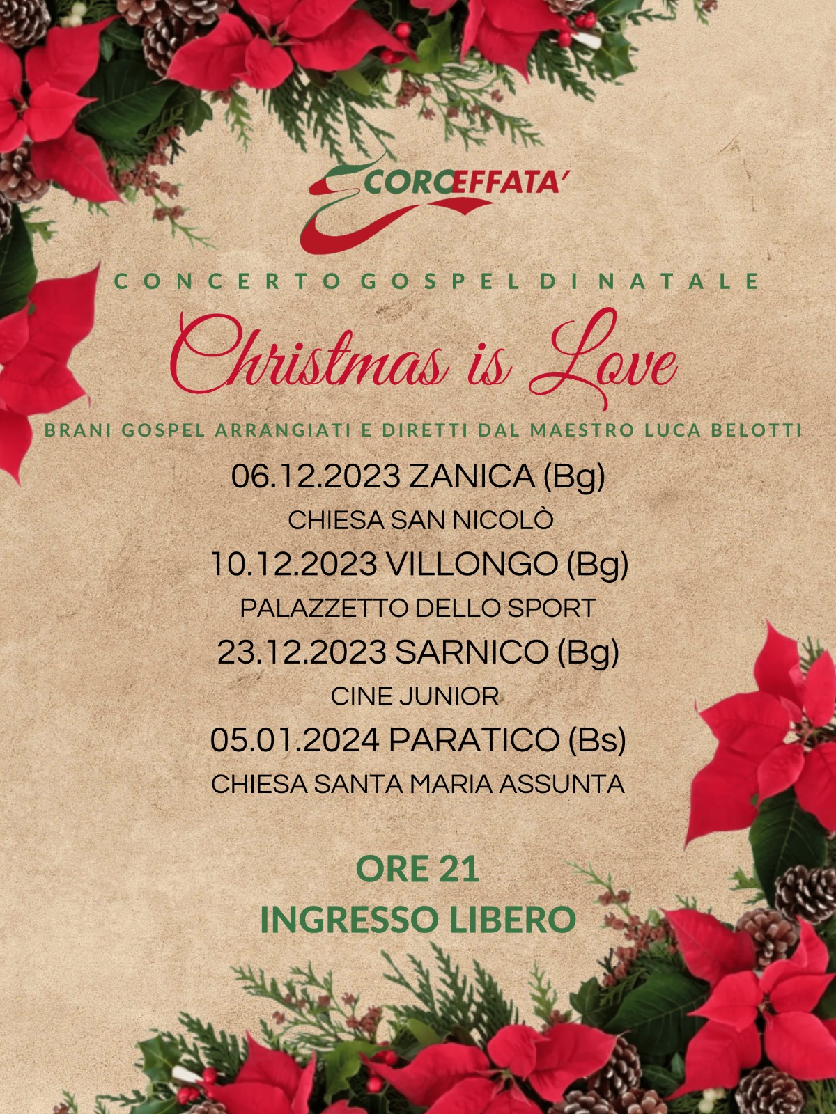 Domenica 10 dicembre, alle ore 21:00, presso il Palazzetto dello Sport di Villongo, si terrà il Concerto Gospel di Natale "Christmas is Love" a cura del Coro Effatà.