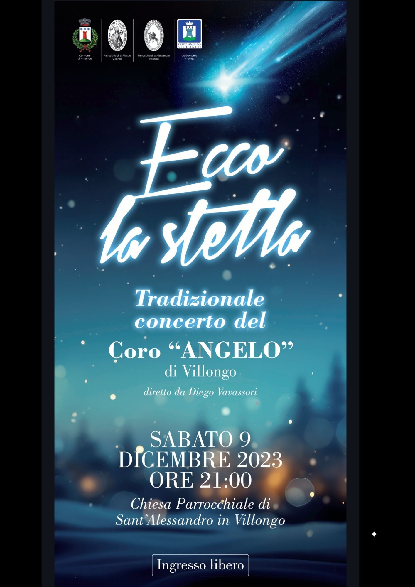 Sabato 9 dicembre, alle ore 21.00, presso la Chiesa Parrocchiale di Sant'Alessandro in Villongo, si terrà "Ecco la stella", il tradizionale concerto del Coro Angelo di Villongo e diretto da Diego Vavassori. Ingresso libero
