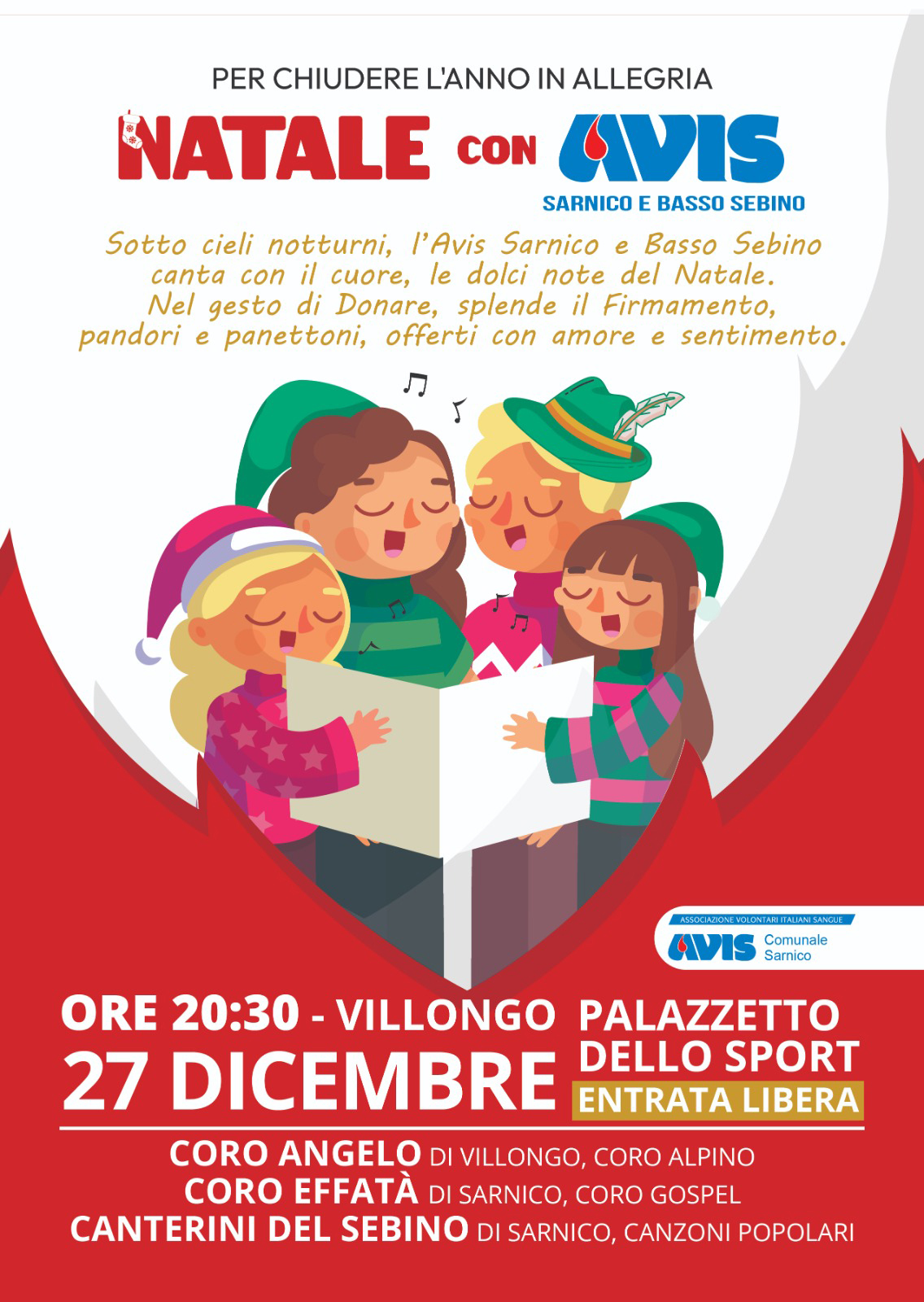 Mercoledì 27 dicembre, alle ore 20:30, avrà luogo Natale con AVIS presso il Palazzetto dello Sport di Villongo. Sotto cieli notturni, l'Avis Sarnico e Basso Sebino canta con il cuore le dolci note del Natale.