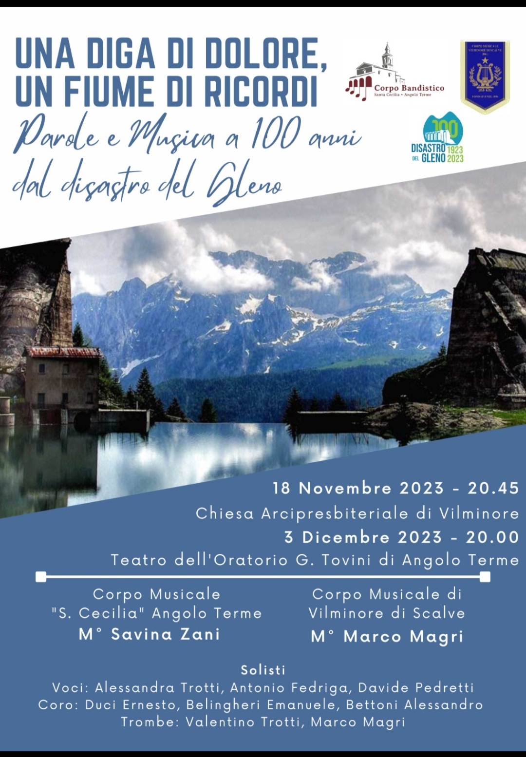 Uno spettacolo che unisce musica corale e orchestrale, in una serata in onore del centenario dal Disastro del Gleno. Sabato 18 novembre si esibiranno il Corpo Musicale "S. Cecilia" di Angolo Terme e il Corpo Musicale di Vilminore di Scalve nella Chiesa Arcipresbiteriale di Vilminore.