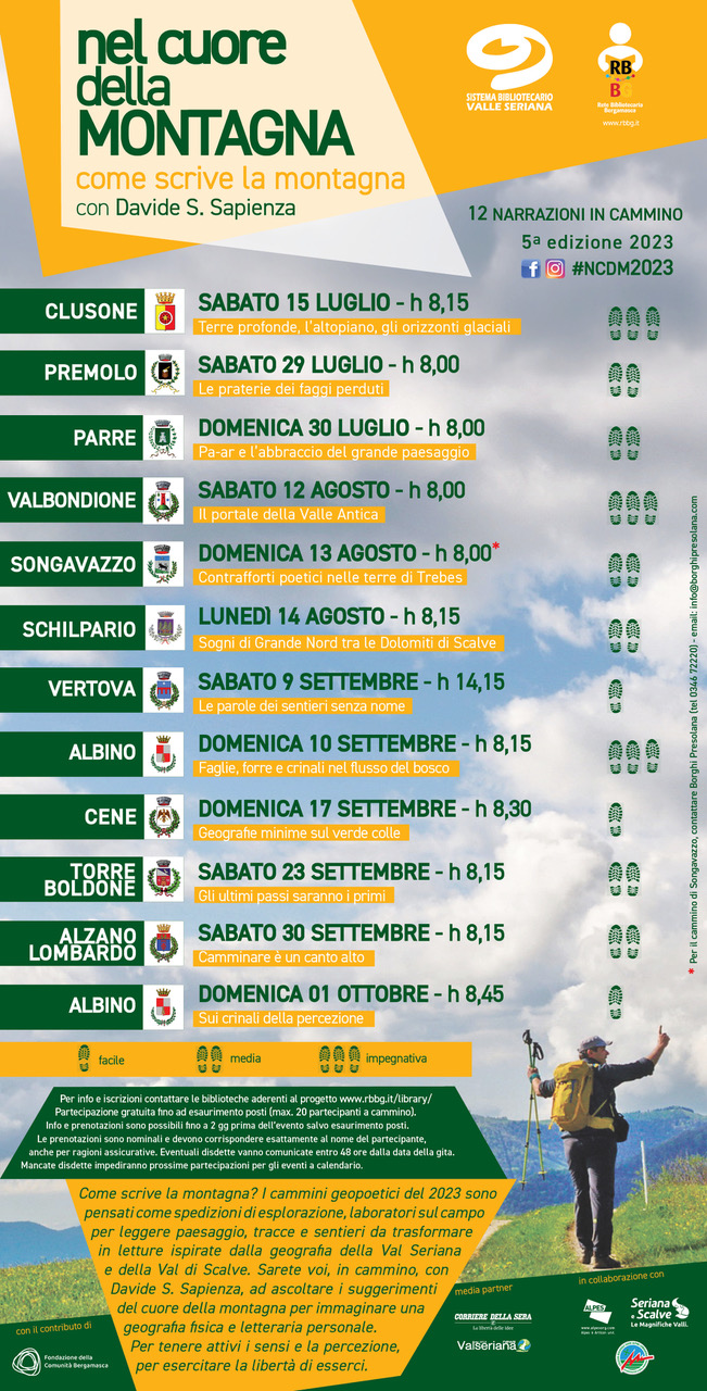La quinta edizione di “Nel Cuore Della Montagna”, il progetto realizzato da Alpes per il Sistema Bibliotecario della Valle Seriana, vedrà ancora protagonista il territorio orobico raccontato da Davide S. Sapienza.