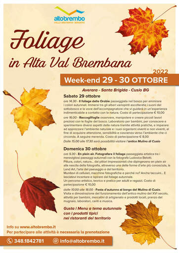 Domenica 30 ottobre al mattino appuntamento imperdibile con “En plein air. Fotografare il foliage”: una passeggiata artistica tra i meravigliosi paesaggi autunnali dei paesi di Altobrembo con Ludovica Belotti, fotografa professionista che, oltre a svelarvi i segreti della fotografia, vi guiderà attraverso una delle forme d’arte più conosciuta, la Land Art, l’arte del paesaggio e del territorio. Potrete mettervi in gioco sperimentando direttamente sul territorio attraverso attività pratiche lasciandovi incantare e ispirare dal foliage autunnale.