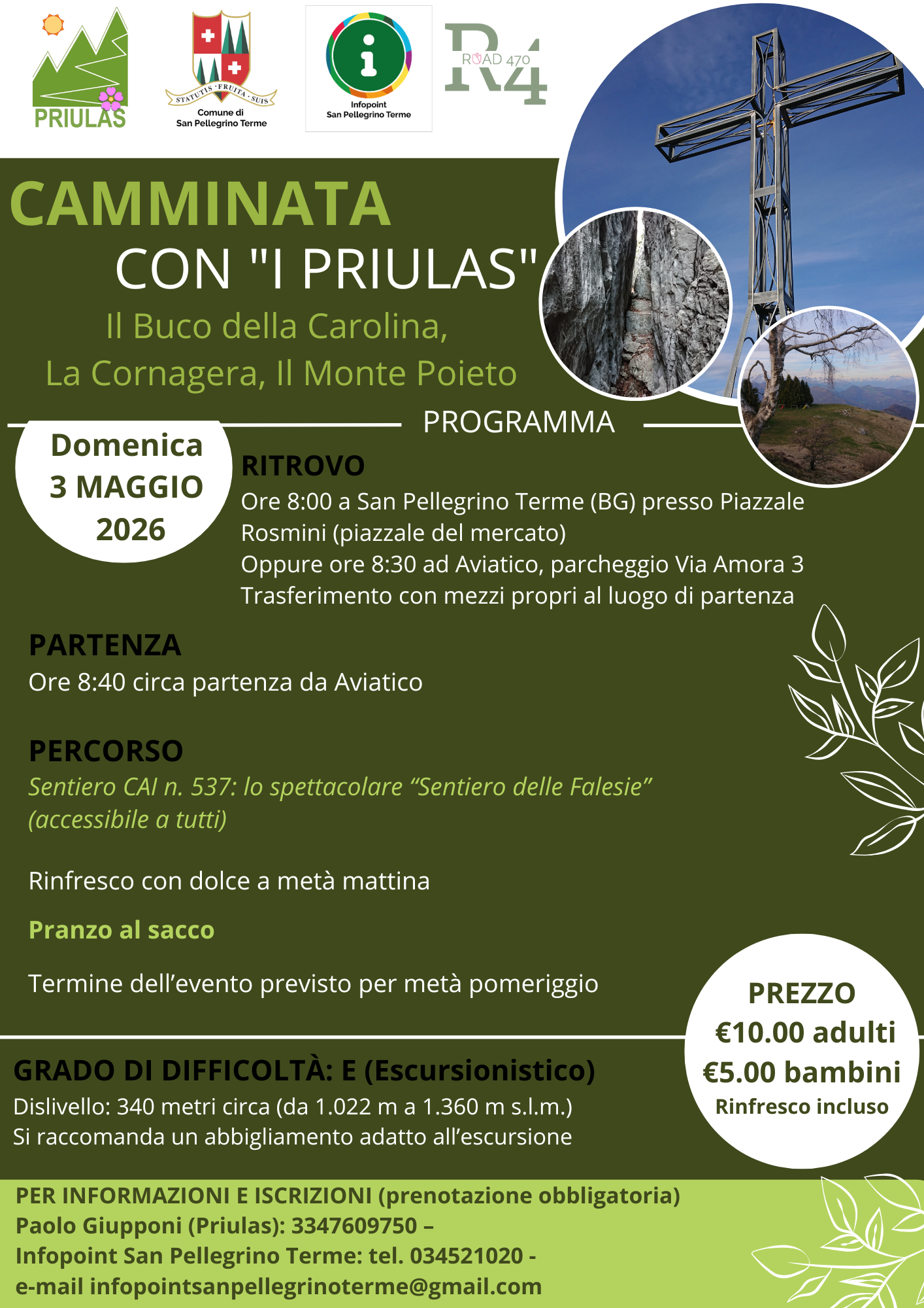 La giornata inizierร con un doppio appuntamento per il ritrovo: alle 8 presso il Piazzale Rosmini a San Pellegrino Terme oppure direttamente ad Aviatico alle 8:30, in via Amora 3. Il trasferimento verso il punto di inizio avverrร con mezzi propri, mentre la partenza effettiva a piedi รจ fissata per le 8:40 circa da Aviatico. Durante la mattinata รจ previsto un momento di ristoro con la distribuzione di dolci, mentre per il pasto principale i partecipanti dovranno provvedere autonomamente con un pranzo al sacco.