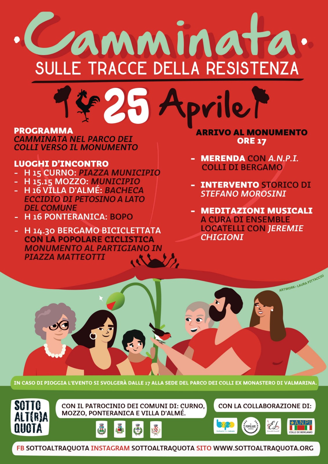 La โCamminata sulla tracce della Resistenzaโ รจ unโiniziativa dellโassociazione Sotto Alt(r)a Quota con il patrocinio dei Comuni di Curno, Mozzo, Ponteranica e Villa DโAlmรจ e con la collaborazione dellโA.N.P.I. dei Colli di Bergamo, La Popolare ciclistica, lโEnsemble Locatelli e il di BoPo. Inclusivi per natura.