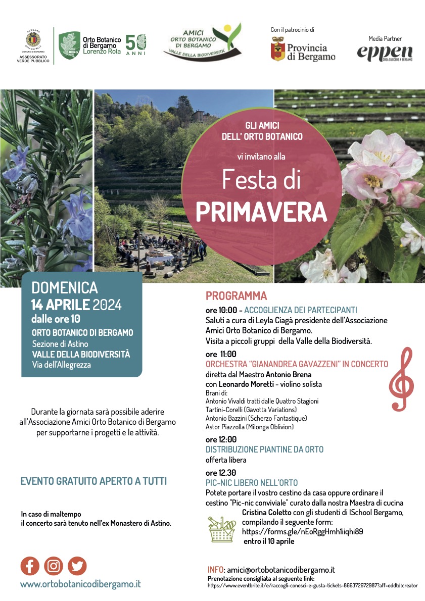 ore 10:00 Accoglienza dei partecipanti e saluti a cura di Leyla Ciagà presidente dell’associazione Amici Orto Botanico di Bergamo. Visita a piccoli gruppi della Valle della Biodiversità.
