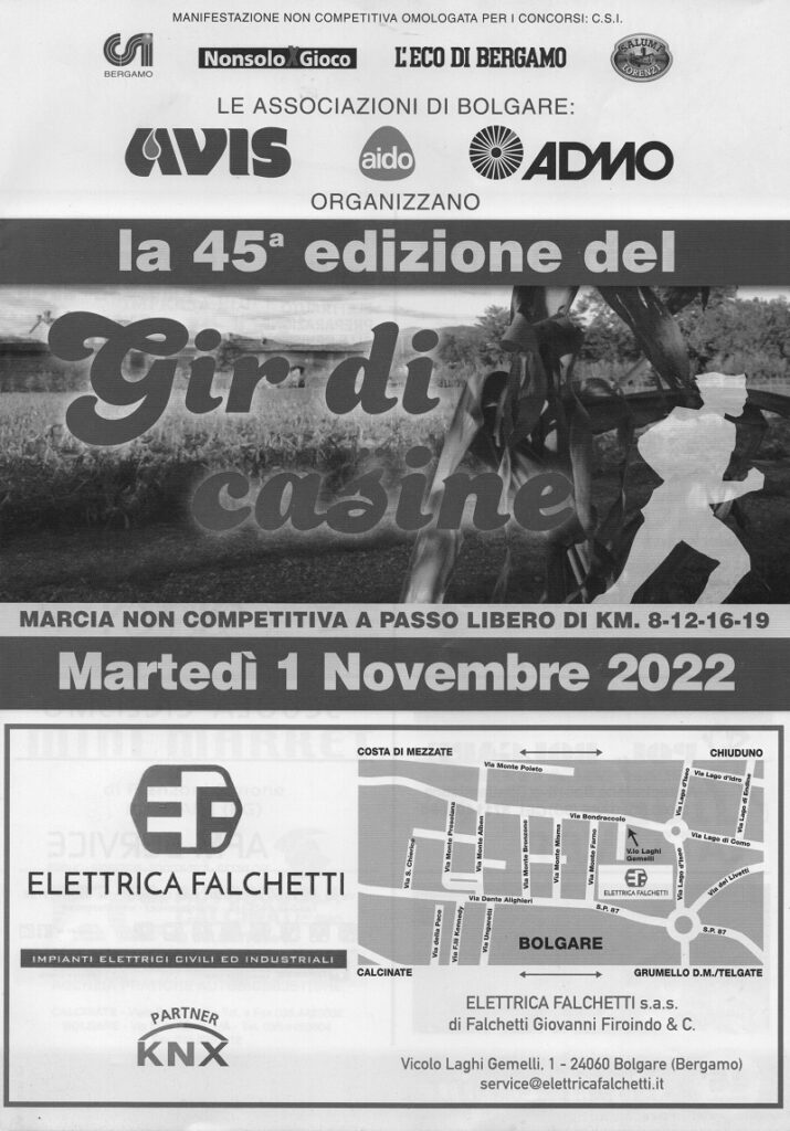 Le associazioni Avis Aido e Admo propongono la 47esima edizione del "Gir di Casìne" che riunisce la moltitudine di podiste e podisti affezionati alla manifestazione, tradizionale incontro dell'1 novembre a Bolgare.