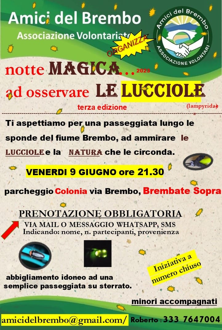 L'associazione di volontari "Amici del Brembo" organizza una passeggiata lungo le sponde del fiume Brembo per ammirare le lucciole e la natura che le circonda.