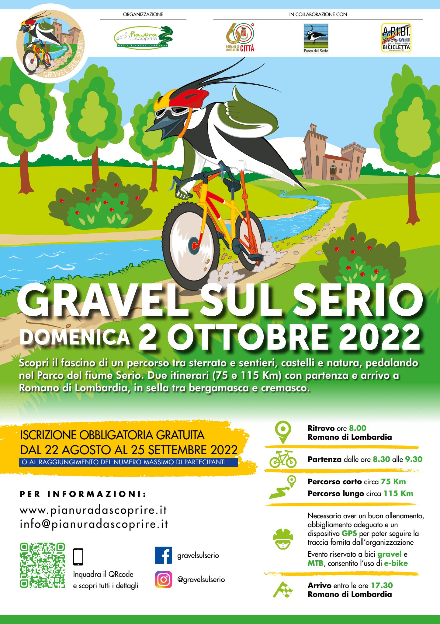 Gravel Sul Serio 2023 andrà ad esplorare le sponde del Fiume Serio, con partenza da Romano di Lombardia (sede del Parco del Serio). Percorreremo le strade secondarie e sterrate che ci porteranno fino al ponte ciclopedonale di Crema dopo aver costeggiato le sponde del fiume e i fontanili della bassa. Si passerà così sulla sponda opposta risalendo il corso del fiume. I due percorsi si divideranno nel territorio di Bariano: quello lungo proseguirà verso l’Oasi di Seriate, incrociando diversi punti di interesse, restando immersi nella natura e pedalando tra laghetti, sorgive, fontanili e piccole cappelle. Passaggio d’obbligo ai castelli di Cavernago e Malpaga. Entrambi i percorsi si ricongiungeranno poi nella campagna romanese, qui incroceremo l’Orto Botanico e potremo così concludere questa avventura nel centro storico di Romano di Lombardia.