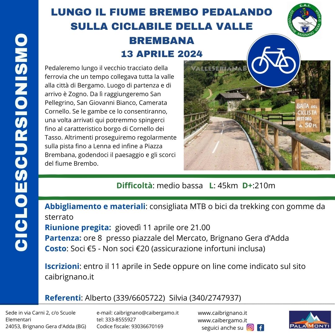 - iscrizioni: entro 11 aprile in sede oppure online come indicato sul sito del CAI Brignano