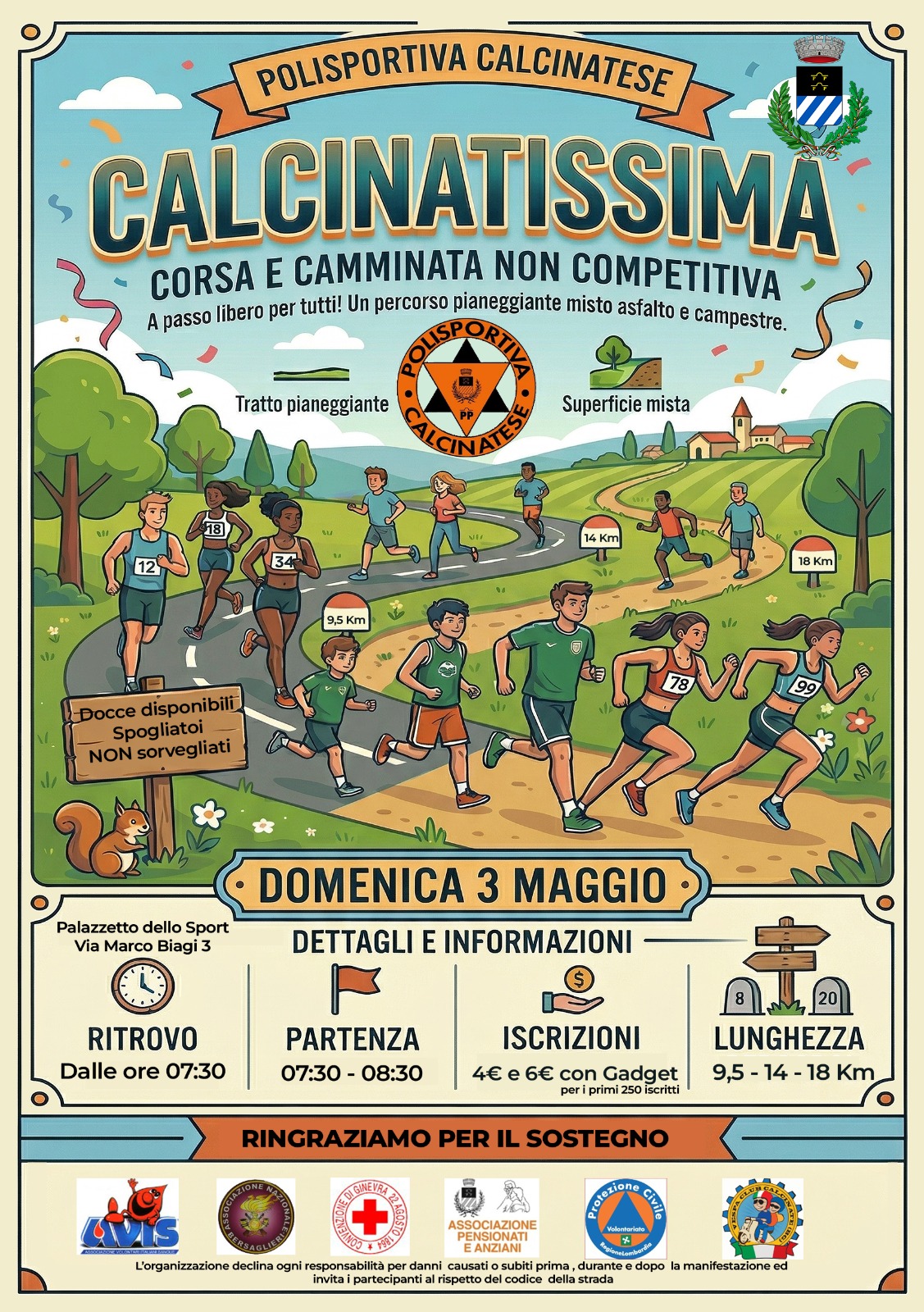 La polisportiva calcinatese organizza la camminata non competitiva a passo libero pianeggiante mista asfalto e campestre ยซCalcinatissimaยป, con tre percorsi di diversa difficoltร .