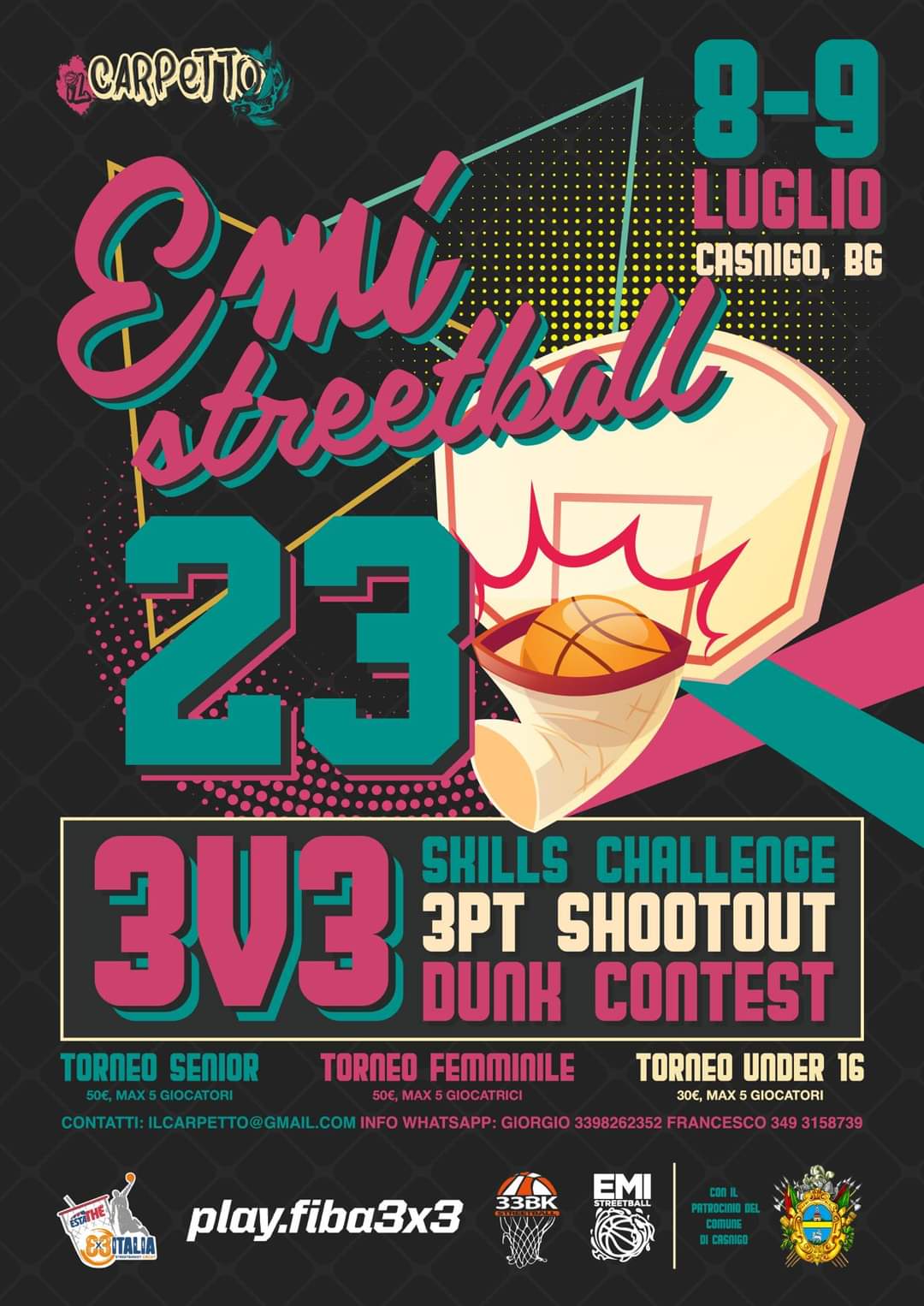 È in programma a Casnigo il torneo “Emi Street Ball 2023” con teatro il campo da basket comunale di Via Valle nel nuovo allestimento creato dalla street artist bergamasca Ale Senso, che vive a Berlino. Un allestimento dedicato a Emiliano Perani, artista, fotografo e sportivo morto nei giorni della pandemia a soli 34 anni.