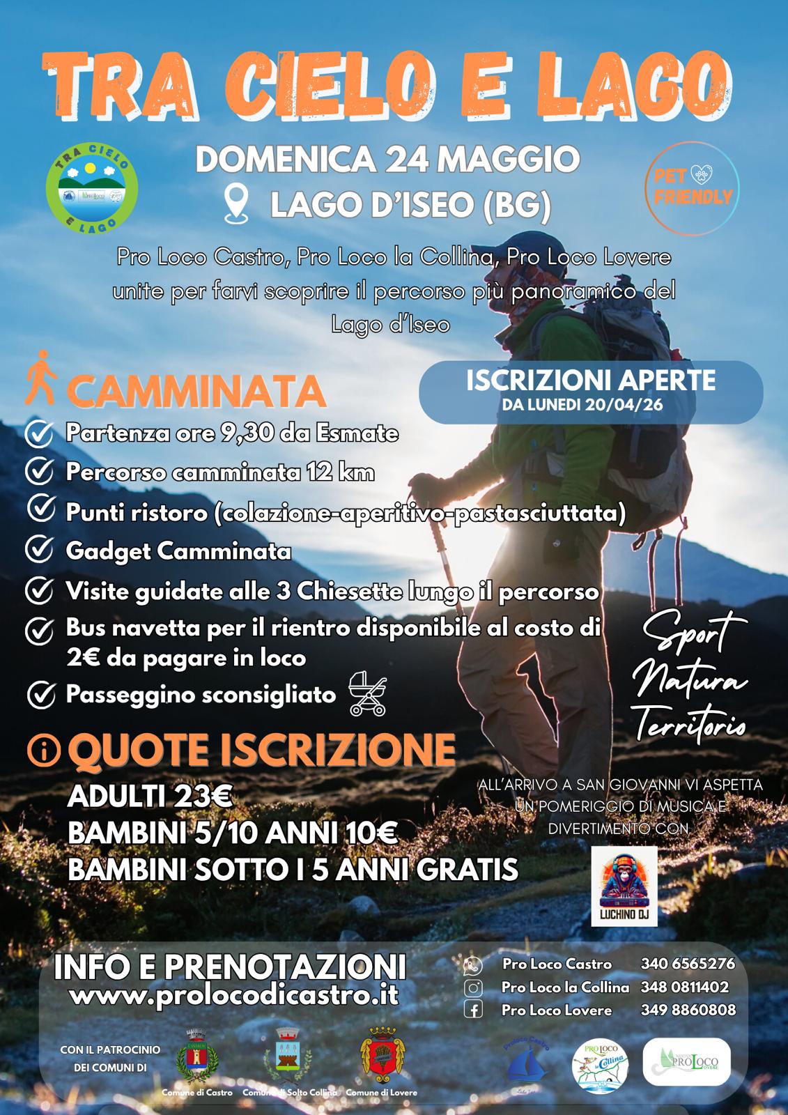 Domenica 24 maggio Pro Loco Castro, Pro Loco La Collina e Nuova Pro Loco Lovere si uniranno insieme per organizzare la camminata panoramica ยซTra cielo e lagoยป con punti ristoro nell'Alto lago d'Iseo.