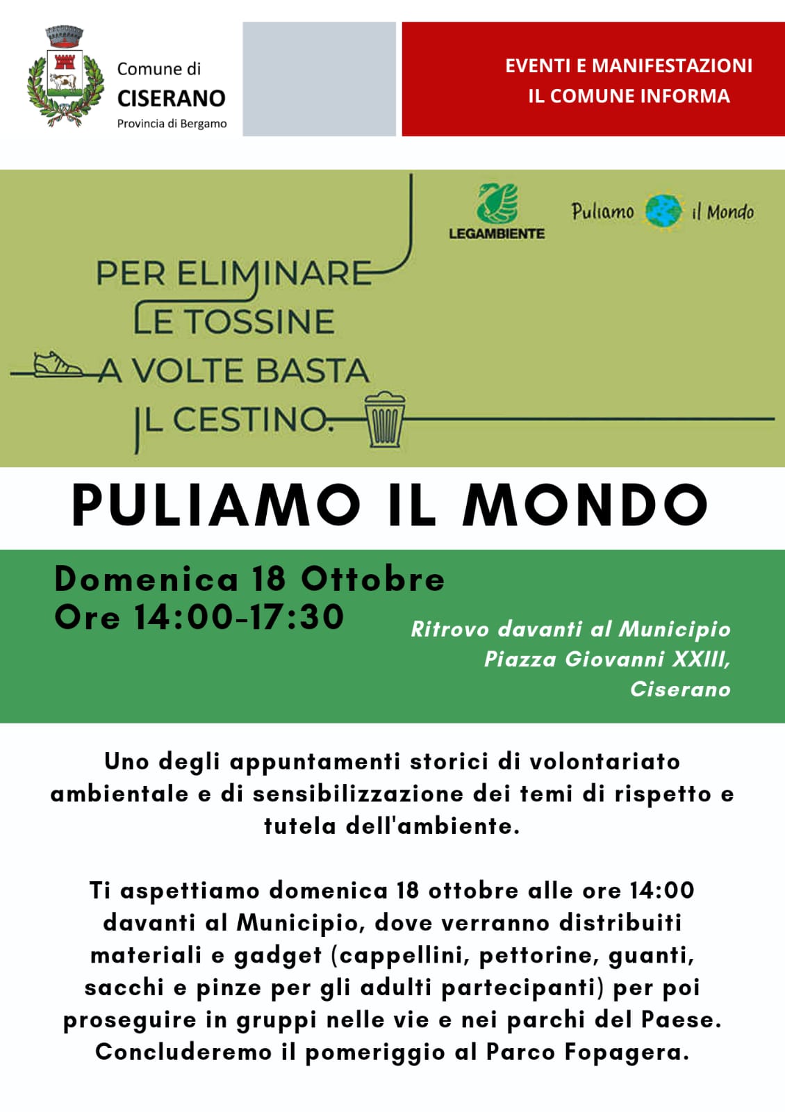 Domenica 18 ottobre appuntamento alle 14 davanti al municipio dove verranno distribuiti materiali e gadget tra cui cappellini pettorine guanti sacchi pinze per gli adulti partecipanti per poi proseguire in gruppi nelle vie e nei parchi del paese.