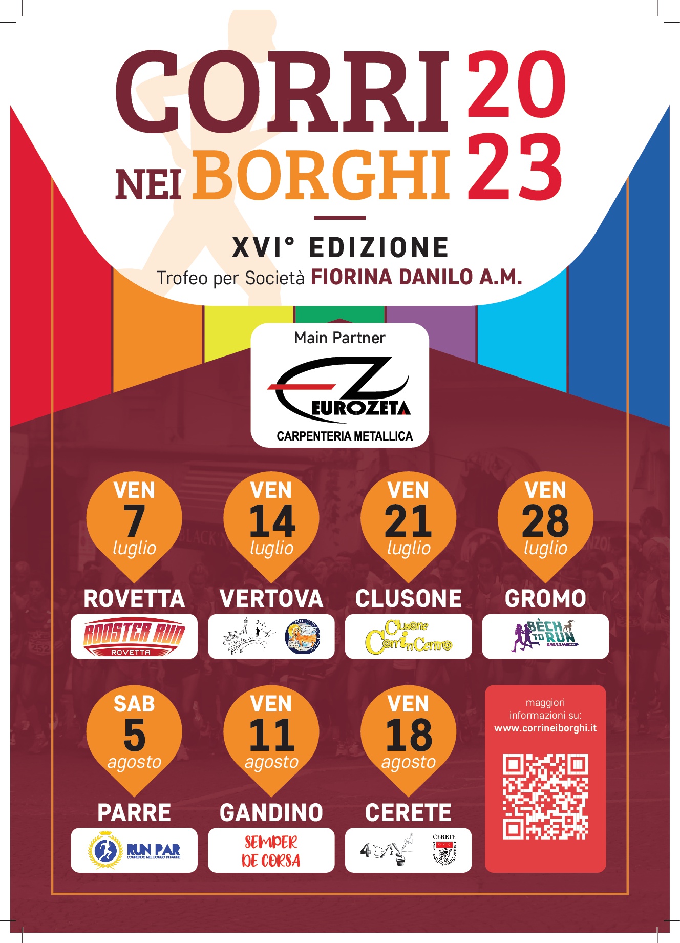 Torna anche nel 2023 la nuova edizione di “Corri nei borghi”, l’immancabile evento podistico che coinvolge i principali borghi dell’alta ValSeriana: una festa dello sport, divertimento e condivisa allegria. L’edizione numero XVI prenderà il via ufficialmente venerdì 7 luglio a Rovetta, con la prima non competitiva liberi e le due gare FIDAL femminile e maschile. Sette gli appuntamenti complessivi per sette paesi coinvolti che attendono un folto numero di atleti dalle province lombarde.