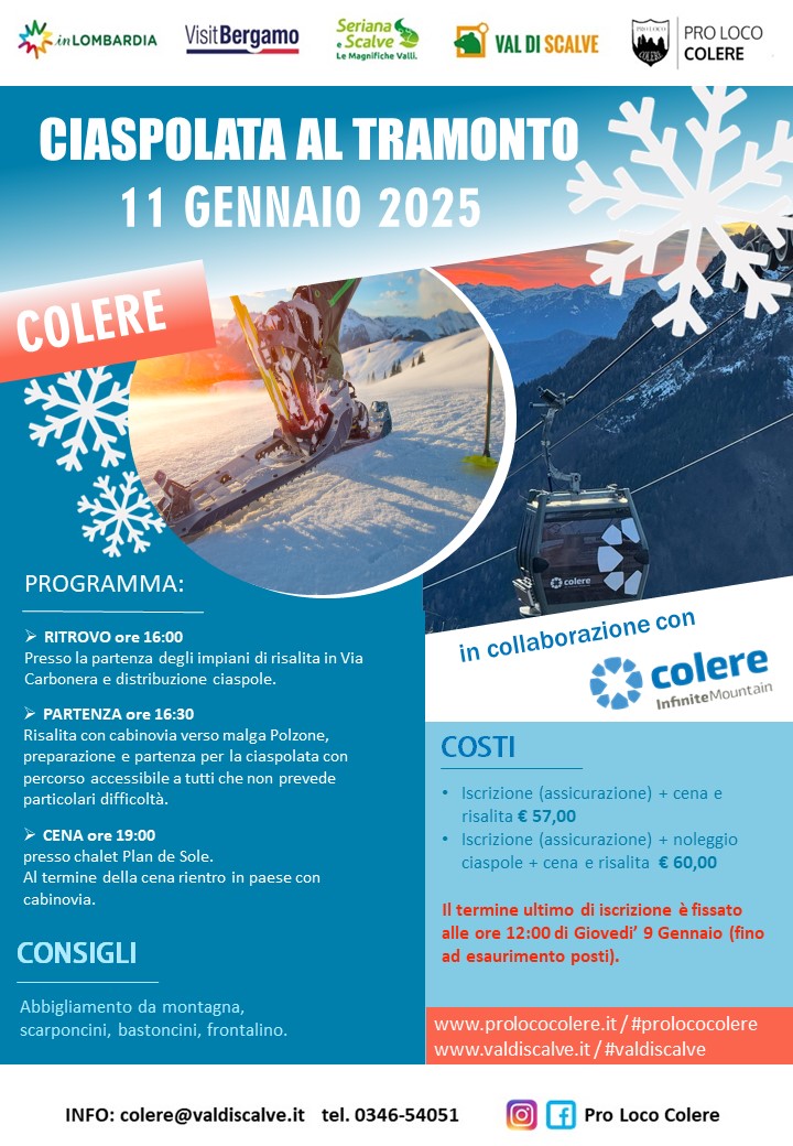 - Il ritrovo è alle 16 presso la partenza degli impianti di risalita in Via Carbonera. Verranno distribuite le ciaspole.