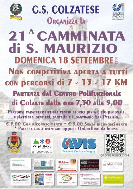 La C. S. Colzatese organizza la 21esima camminata non competitiva dedicata a San Maurizio. La manifestazione ha come punto di ritrovo e di arrivo il centro Polifunzionale, in Via Bonfanti a Colzate dalle 7,30 alle 9.