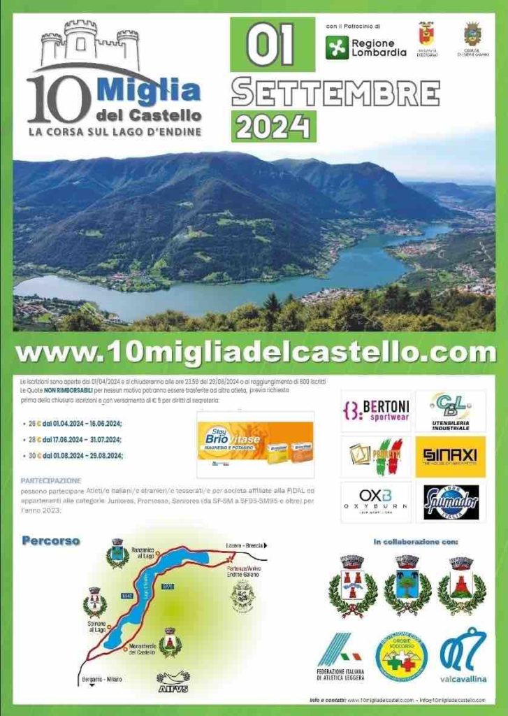 La “10 Miglia del Castello” sul lago di Endine, è una corsa unica nel suo genere, in quanto la sua peculiarità sta nel completare il giro di questo, se pur piccolo, grazioso lago. Il percorso, infatti, è stato pensato per esaltare la bellezza degli scorci lacustri e non, come il Castello di Monasterolo e la graziosa Piazza nella frazione San Felice al lago, che si susseguono rapidamente, sottolineando colori, vegetazione e fauna.