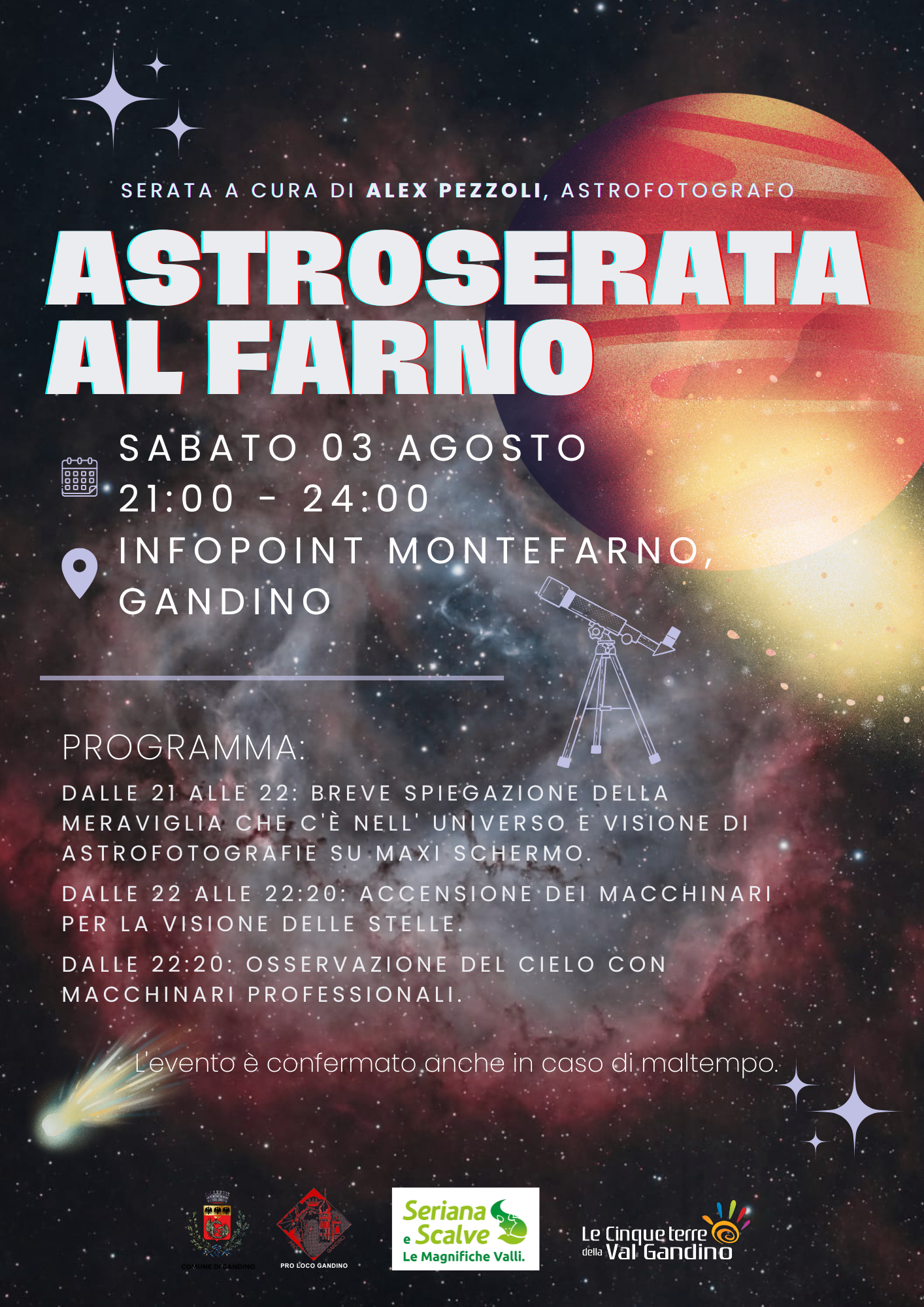 Sabato 3 agosto serata a cura di Alex Pezzoli, Astrofotografo