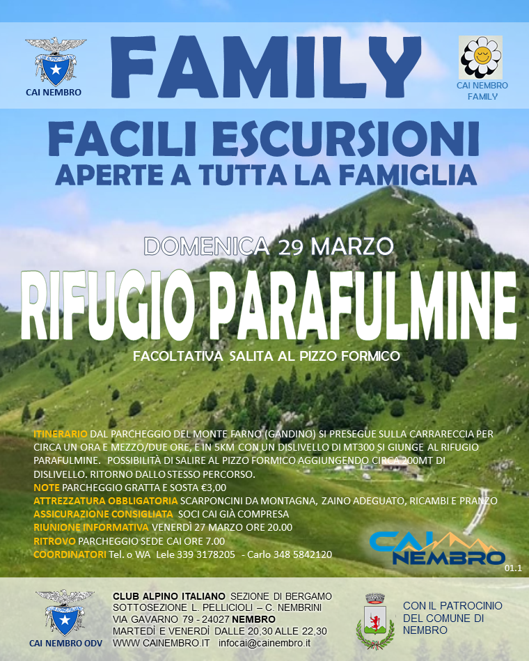 La sezione di Nembro del CAI propone una nuova iniziativa pensata per tutta la famiglia: una facile escursione immersa nella natura, adatta anche ai piรน piccoli, verso il Rifugio Parafulmine.