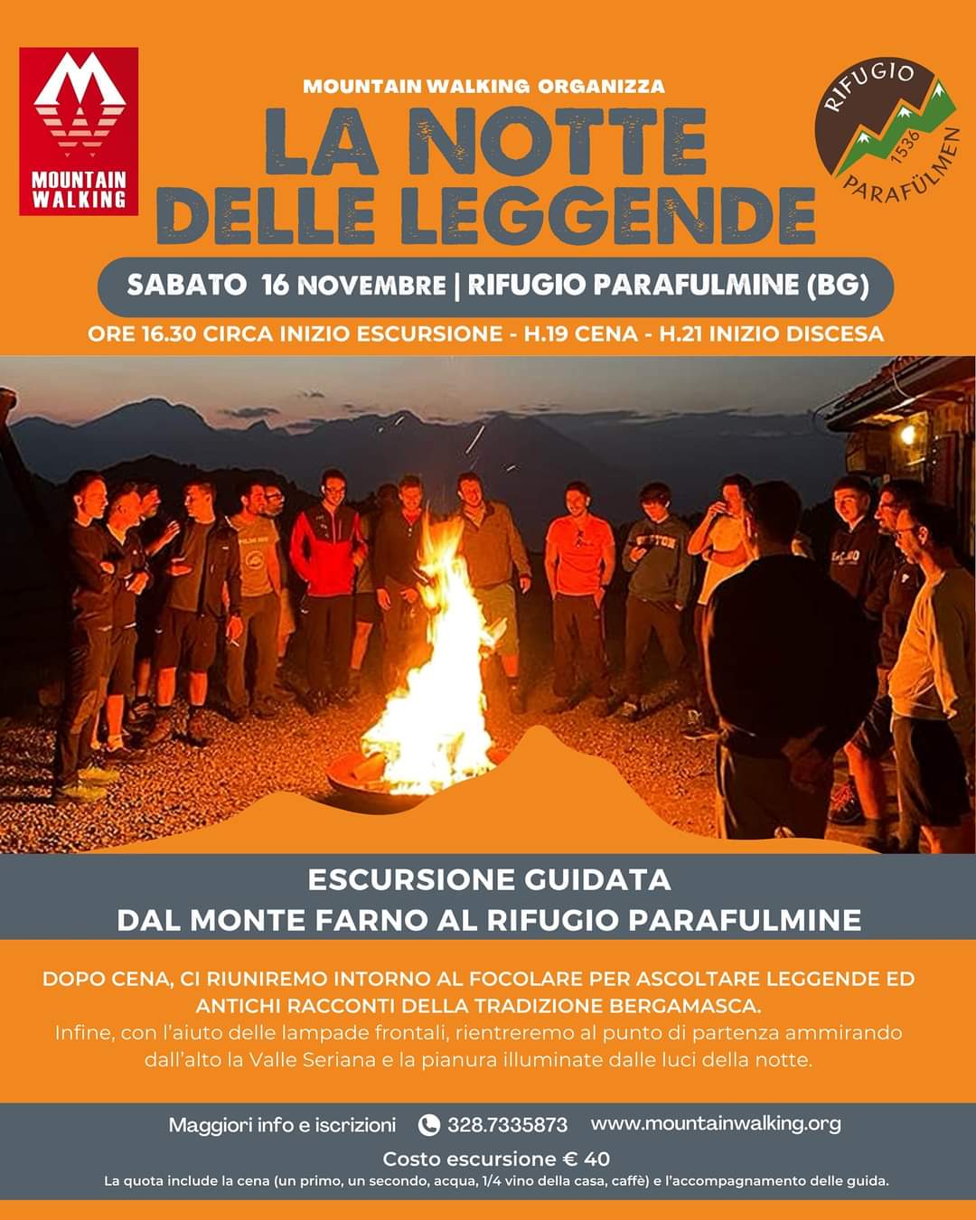 Escursione guidata dal Monte Farno al Rifugio Parafulmine, organizzata da Mountain Walking, alla scoperta di leggende e antichi racconti della tradizione bergamasca, riuniti intorno al fuoco.