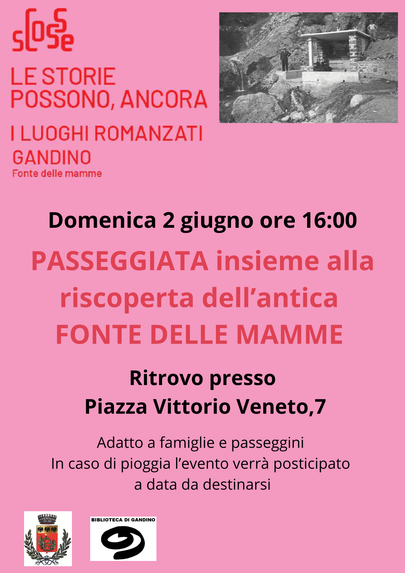Domenica 2 giugno la Biblioteca Comunale di Gandino organizza l’evento conclusivo de “I luoghi romanzati”, realizzato nell’ambito del progetto “Scosse, le storie possono salvarci”, organizzato dal Sistema Bibliotecario Valle Seriana. Si tratta di una passeggiata gratuita aperta e consigliata a famiglie (percorso possibile anche per passeggini e carrozzine) e cittadini, per riscoprire insieme l’antica “Fonte delle Mamme”. Ritrovo alle ore 16 in piazza Vittorio Veneto.