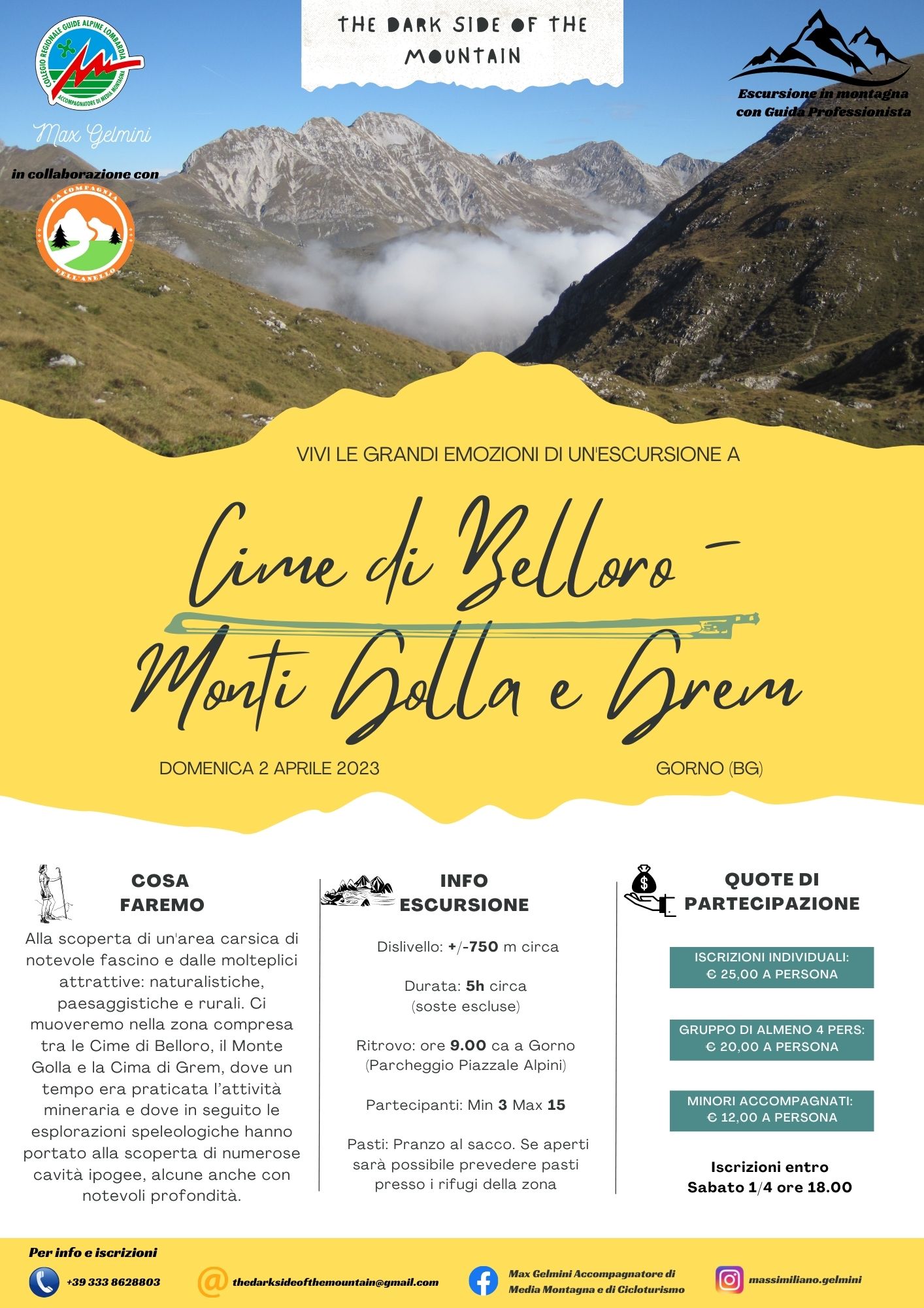 Accompagnati dalle guide alpine alla scoperta di unโarea carsica di notevole fascino e dalle molteplici attrattive: naturalistiche, paesaggistiche e rurali. Ci muoveremo nella zona compresa tra le Cime di Belloro, il Monte Golla e la Cima di Grem, dove un tempo era praticata lโattivitร mineraria e dove in seguito le esplorazioni speleologiche hanno portato ala scoperta di numerose cavita ipogee, alcune anche con notevoli profonditร .