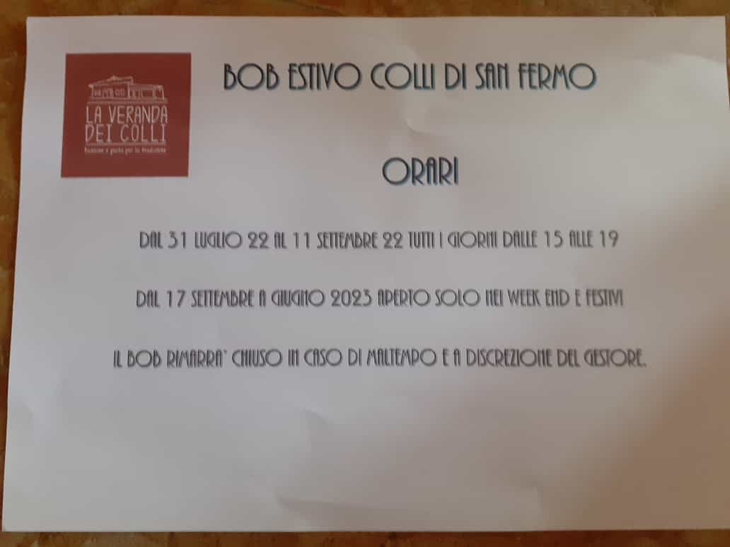 Il nuovo gestore "La veranda dei colli" è lieto di informare la nuova apertura stagionale del bob estivo, dal 30 luglio 2022 e la fruibilità del servizio nel weekend e festivi nel resto dell'anno.