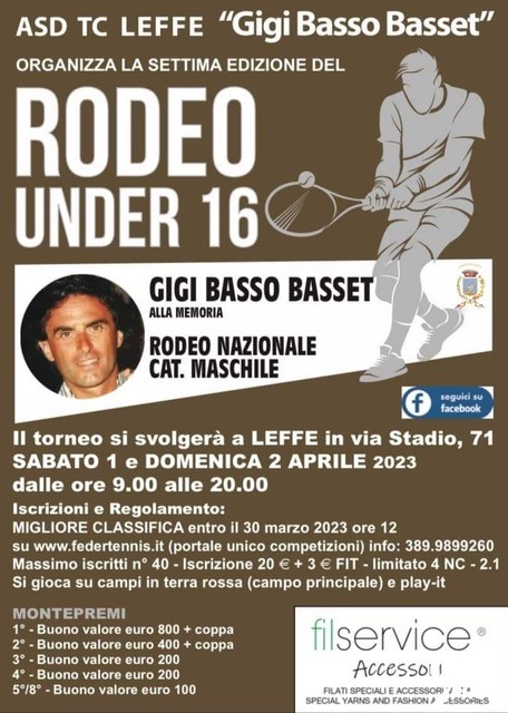 Il weekend dell'1-2 aprile 2023 ci sarà il Rodeo under 16 maschile giunto alla settima edizione e organizzato dal TC Leffe presso i campi da gioco siti a fianco del Martinelli in via Stadio.