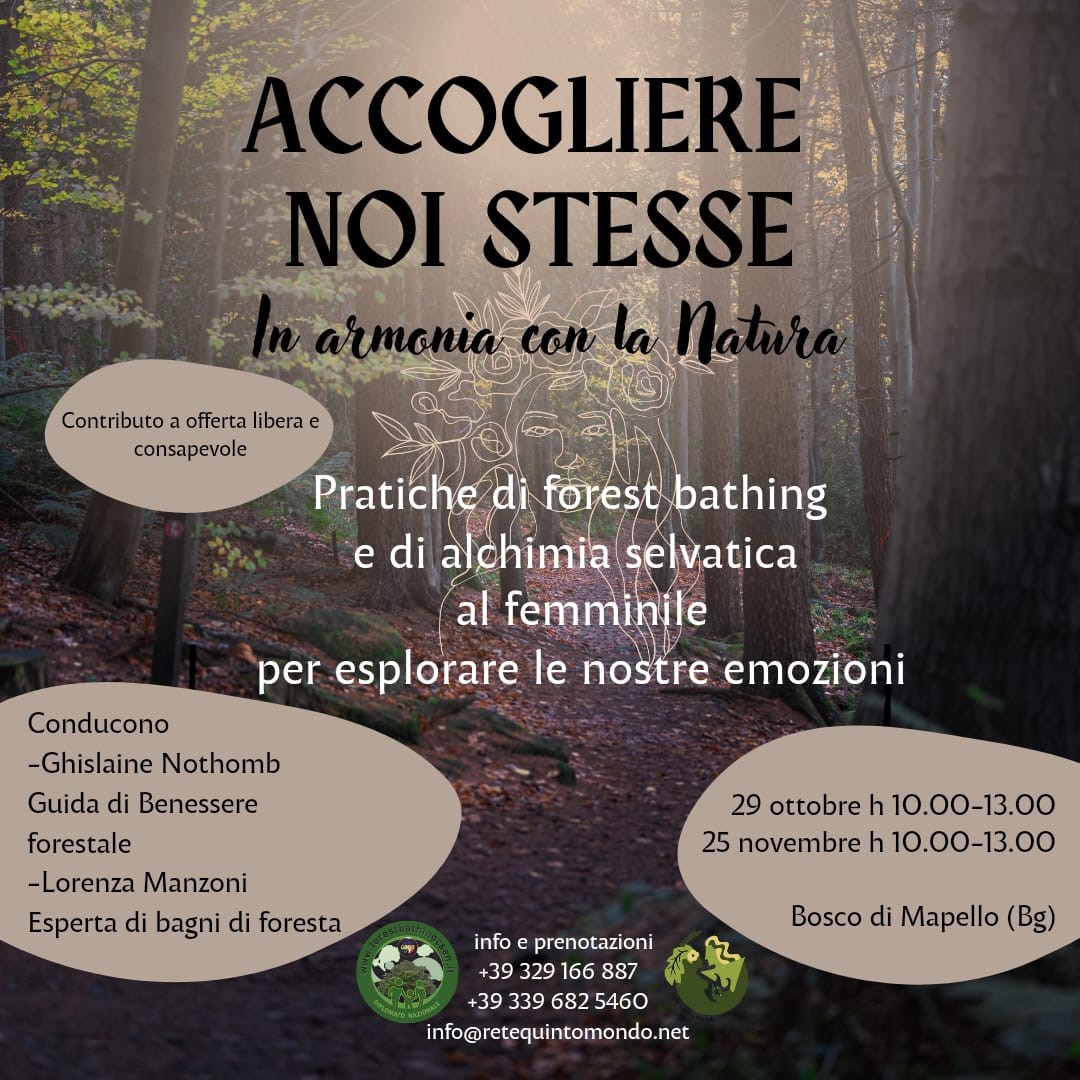 L'incontro è condotto da Ghislaine Nothomb, educatrice outdoor, esperta in conduzione di cerchi di donne e uomini e guida di bagni di foresta certificata e da Lorenza Manzoni, educatrice, con una formazione sulle connessioni fra malattia e disequilibri fra corpo-mente-spirito e esperta di bagni di foresta.