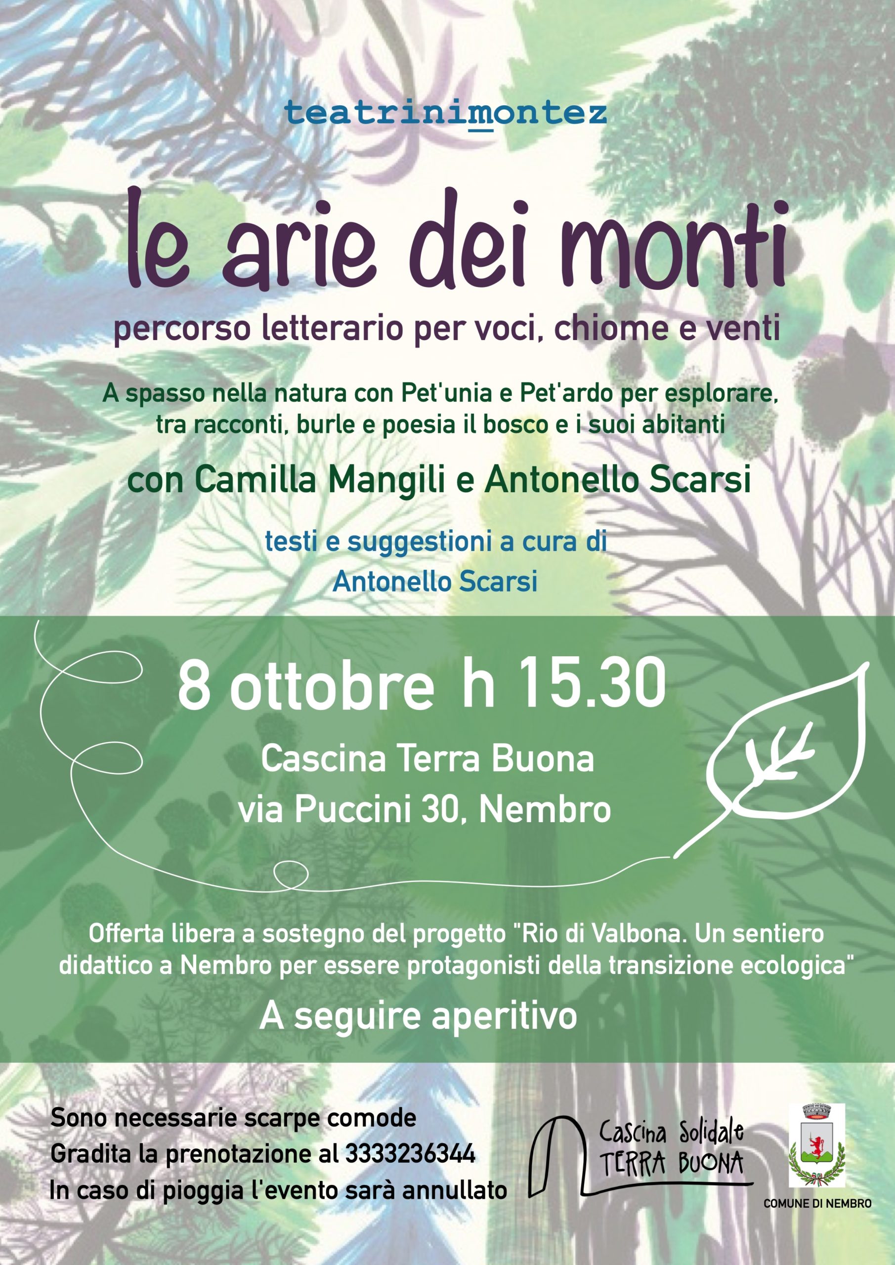 Percorso letterario per voci, chiome e venti. A spasso nella natura con Pet'unia e Pet'ardo per esplorare, tra racconti, burle e poesia, il bosco e i suoi abitanti. A seguire aperitivo. Accompagnati da Camilla Mangili e Antonello Scarsi, testi e suggestioni a cura di Antonello Scarsi. Ritrovo alle ore 15:30 presso la Cascina Solidale Terra Buona a Nembro. Partecipazione con offerta libera a sostegno del progetto "Rio di Valbona: un sentiero didattico a Nembro per essere protagonisti della transizione ecologica". Sono necessarie scarpe comode. È gradita la prenotazione.