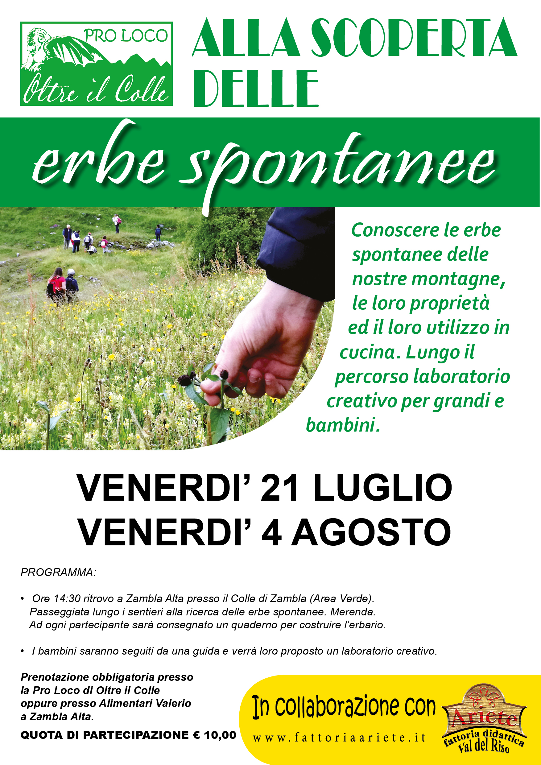 La Pro Loco di Oltre il Colle รจ lieta di annunciare l'evento "Alla scoperta delle erbe spontanee", realizzato in collaborazione con la Fattoria didattica Ariete.