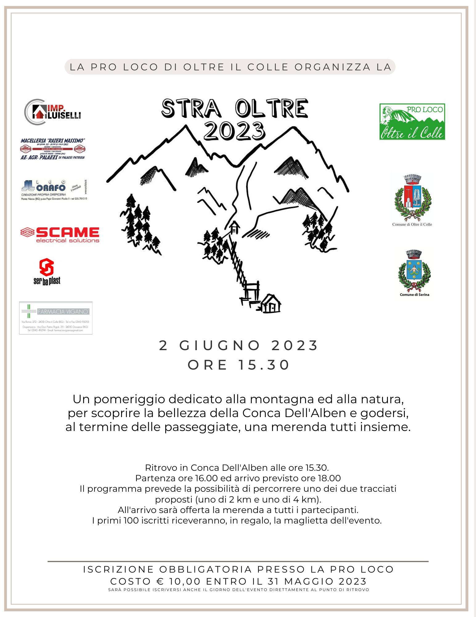 Stra Oltre è la prima edizione dell'evento di corsa non competitiva per tutta la famiglia organizzato dalla Pro Loco di Oltre il Colle. Questa gara aperta a bambini, ragazzi e alle loro famiglie si terrà nella suggestiva Conca dell'Alben.