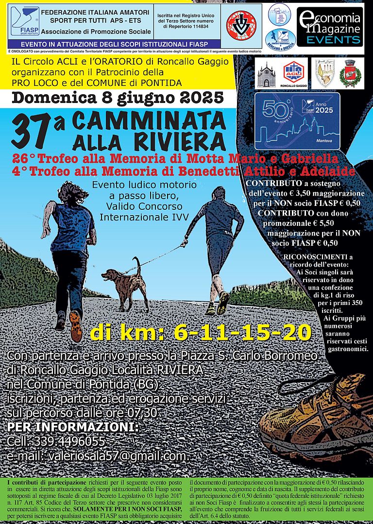 La Federazione Italiana Amatori Sport per Tutti (FIASP) – APS/ETS, iscritta al Registro Unico del Terzo Settore (Repertorio n. 114834), promuove un nuovo appuntamento nell’ambito delle sue finalità istituzionali: una manifestazione ludico-motoria a passo libero, aperta a tutti, omologata dal Comitato Territoriale FIASP competente per territorio. L’evento, intitolato "37esima Camminata alla Riviera", è organizzato dal Circolo ACLI e dall’Oratorio di Roncallo Gaggio, con il patrocinio della Pro Loco e del Comune di Pontida, e intende unire sport, socialità e scoperta del territorio in un contesto naturale e accogliente.