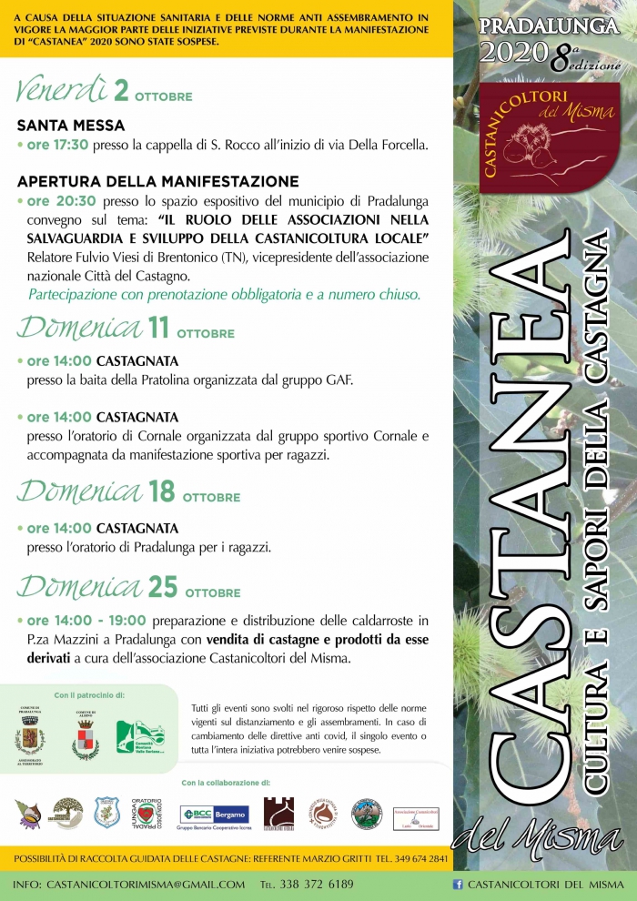 – Apertura Manifestazione alle ore 20.30 presso lo spazio espositivo del municipio di Pradalunga. Convegno sul tema “Il ruolo delle associazioni nella salvaguardia e sviluppo della castanicoltura locale”. Relatore Fulvio Viesi di Brentonico (TN), vicepresidente dell’associazione nazionale Città del Castagno.