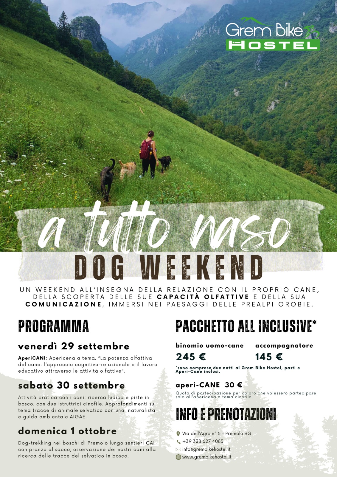 Secondo progetto GremDog dedicato ai nostri amici a 4 zampe, dal 29 di settembre all’1 ottobre passeremo un lungo fine settimana all’insegna della relazione con il proprio cane, della scoperta delle sue capacità olfattive e della sua comunicazione, immersi nei paesaggi delle prealpi orobie.