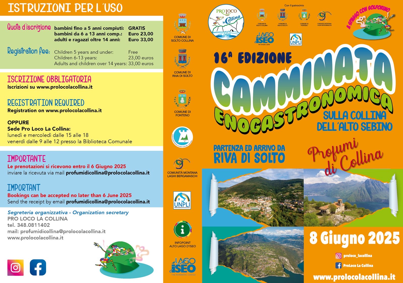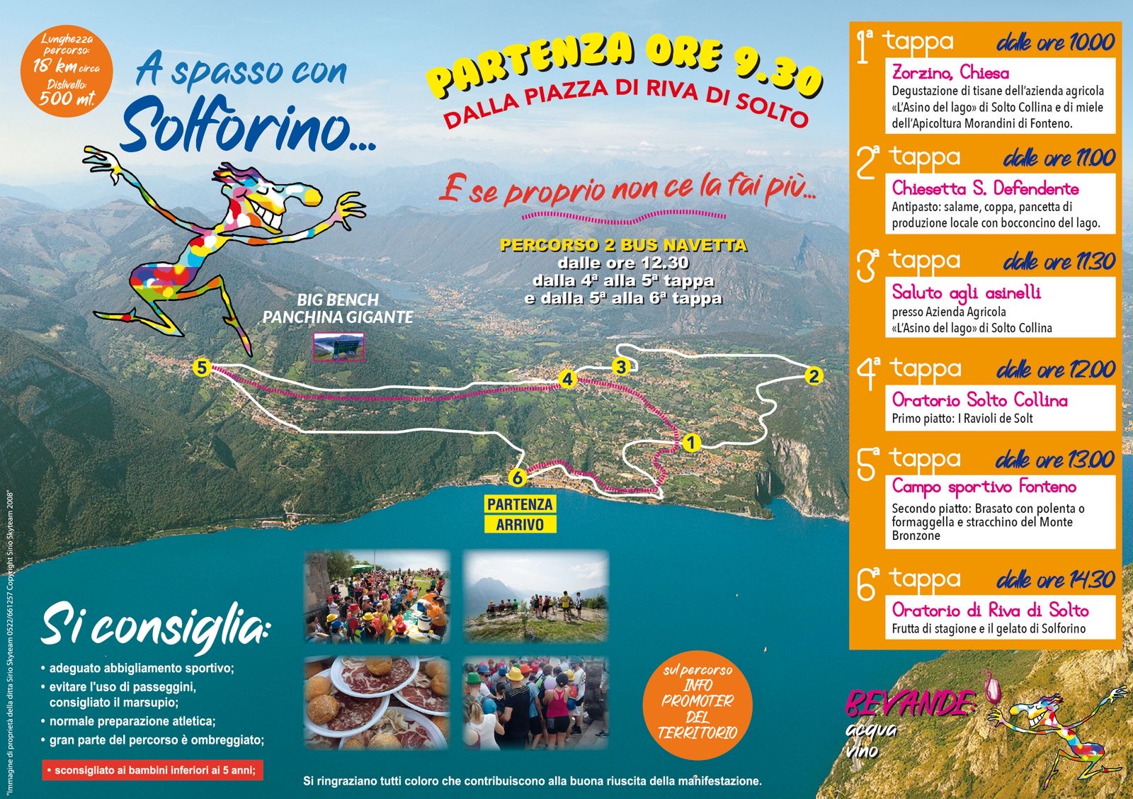 L’itinerario proseguirà verso la frazione di Esmate, per tornare all’azienda L’Asino del Lago, dove i bambini potranno salutare i simpatici asinelli. Da lì, si passerà per il borgo di Solto Collina fino a giungere all’oratorio, dove sarà servito un piatto simbolo della tradizione: i ravioli de Solt, preparati a mano dalle signore del paese. Ultimo sforzo per raggiungere Fonteno, passando dalla scenografica Panchina Gigante, con una sosta al campo sportivo per assaporare un secondo piatto: brasato con polenta, oppure formaggio e stracchino del Monte Bronzone. Infine, dopo una dolce discesa si tornerà a Riva di Solto