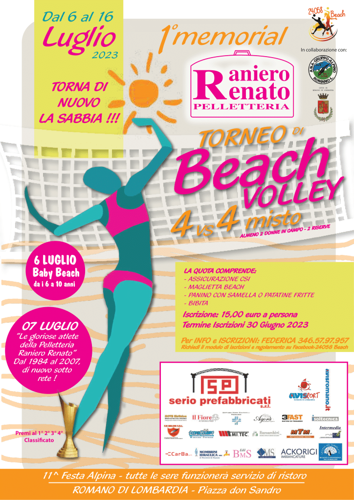Il comune di Romano di Lombardia vi invita a partecipare al torneo di beach volley 4vs4 con almeno due donne e due riserve.