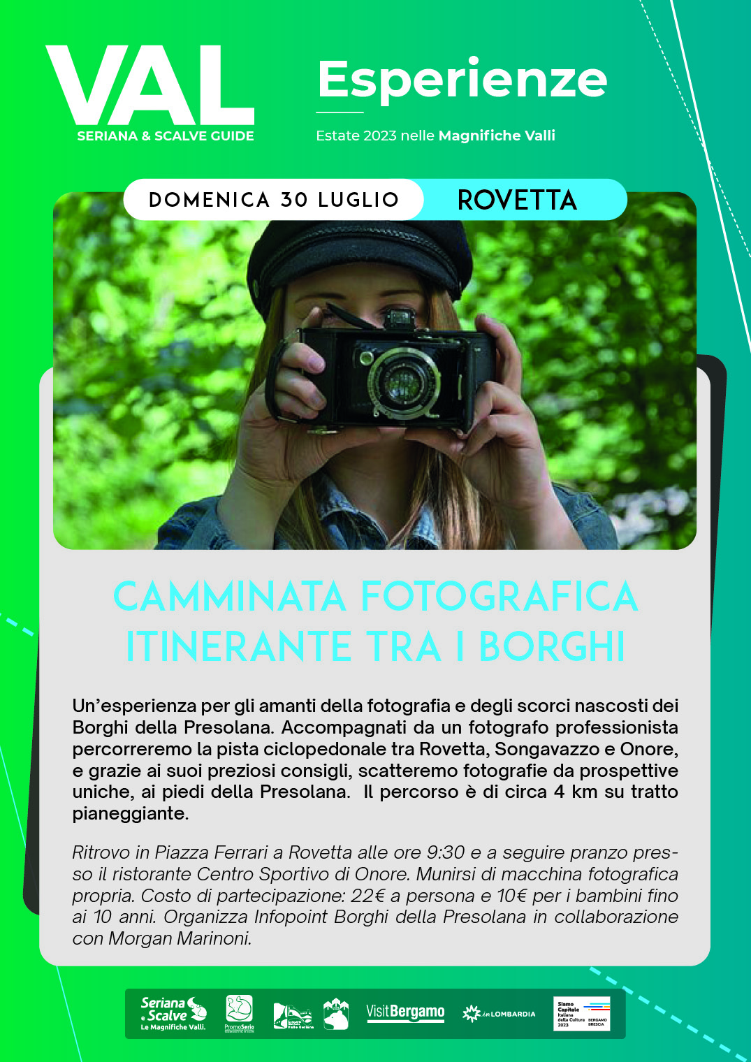 Un'esperienza imperdibile per gli amanti della fotografia e degli scorci nascosti dei Borghi della Presolana: percorreremo la pista ciclopedonale tra Rovetta, Songavazzo e Onore e, con l'aiuto di un fotografo, scatteremo fotografie uniche!