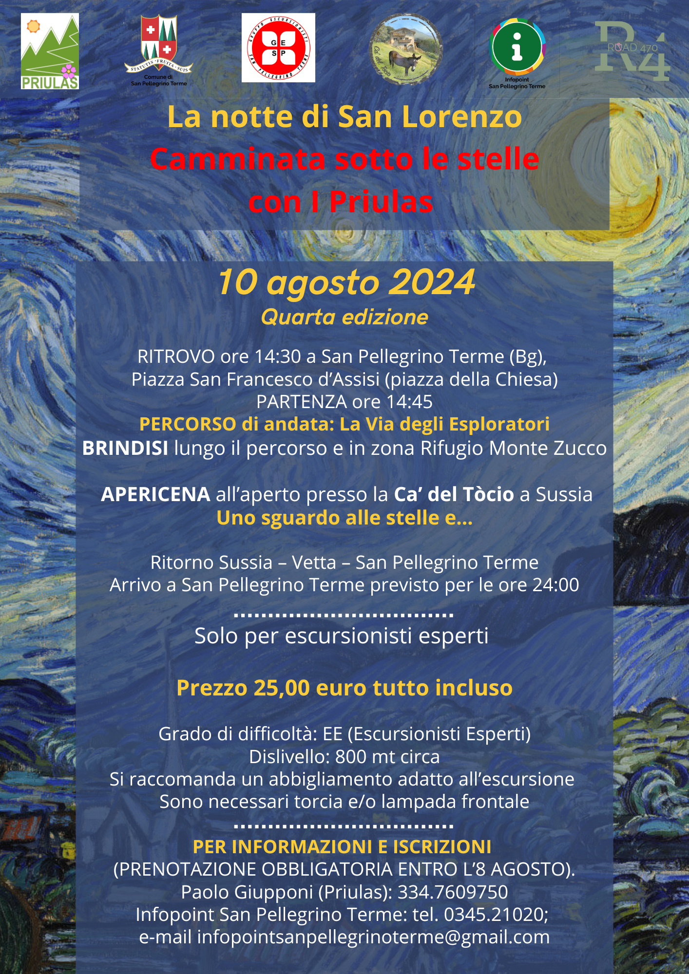 Iscrizioni: La prenotazione è obbligatoria entro l'8 agosto e può essere effettuata contattando Paolo Giupponi (Priulas) al numero 334.7609750 oppure l'Infopoint di San Pellegrino Terme.