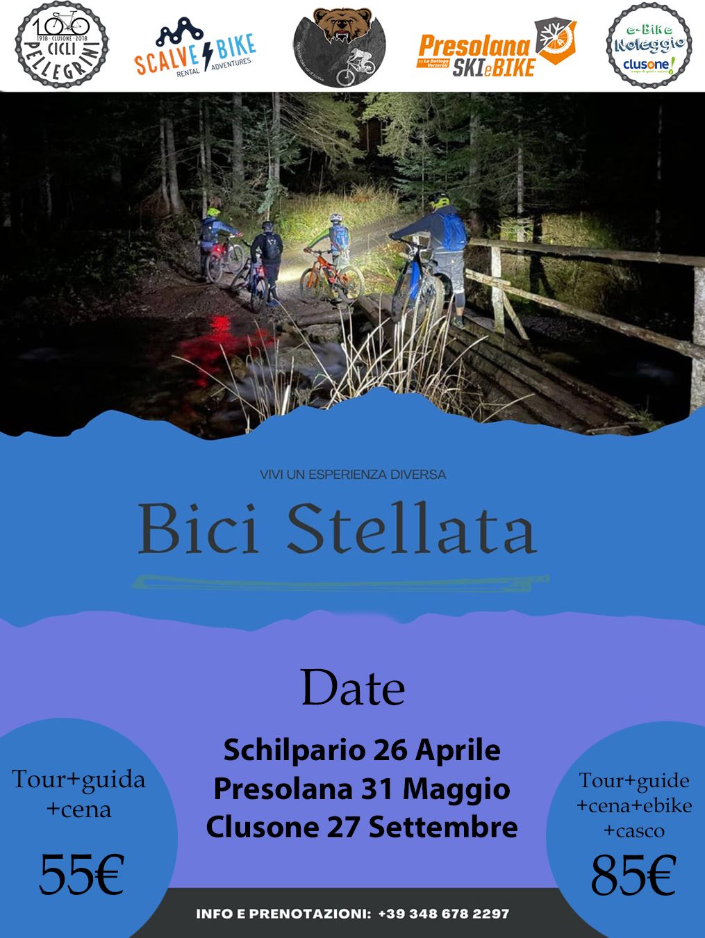 Siete pronti per un'esperienza magica sotto il cielo della Val di Scalve? Anche quest’anno torna l’attesissima escursione notturna in E-Bike organizzata da GuidemtbValdiScalve, in collaborazione con Cicli Pellegrini, Presolana Ski&Bike e il noleggio E-Bike Clusone. Un'occasione unica per pedalare immersi nella natura, lontano dalle luci della città, accompagnati dal silenzio del bosco e dalla luce delle stelle. Un tour guidato adatto a tutti, perfetto per chi cerca avventura, emozione e bellezza in un’unica esperienza. Il primo appuntamento è a Schilpario, sabato 26 aprile: preparate la vostra E-Bike (o prenotatela!) e lasciatevi guidare in un percorso affascinante, dove sport e meraviglia si incontrano sotto il firmamento.