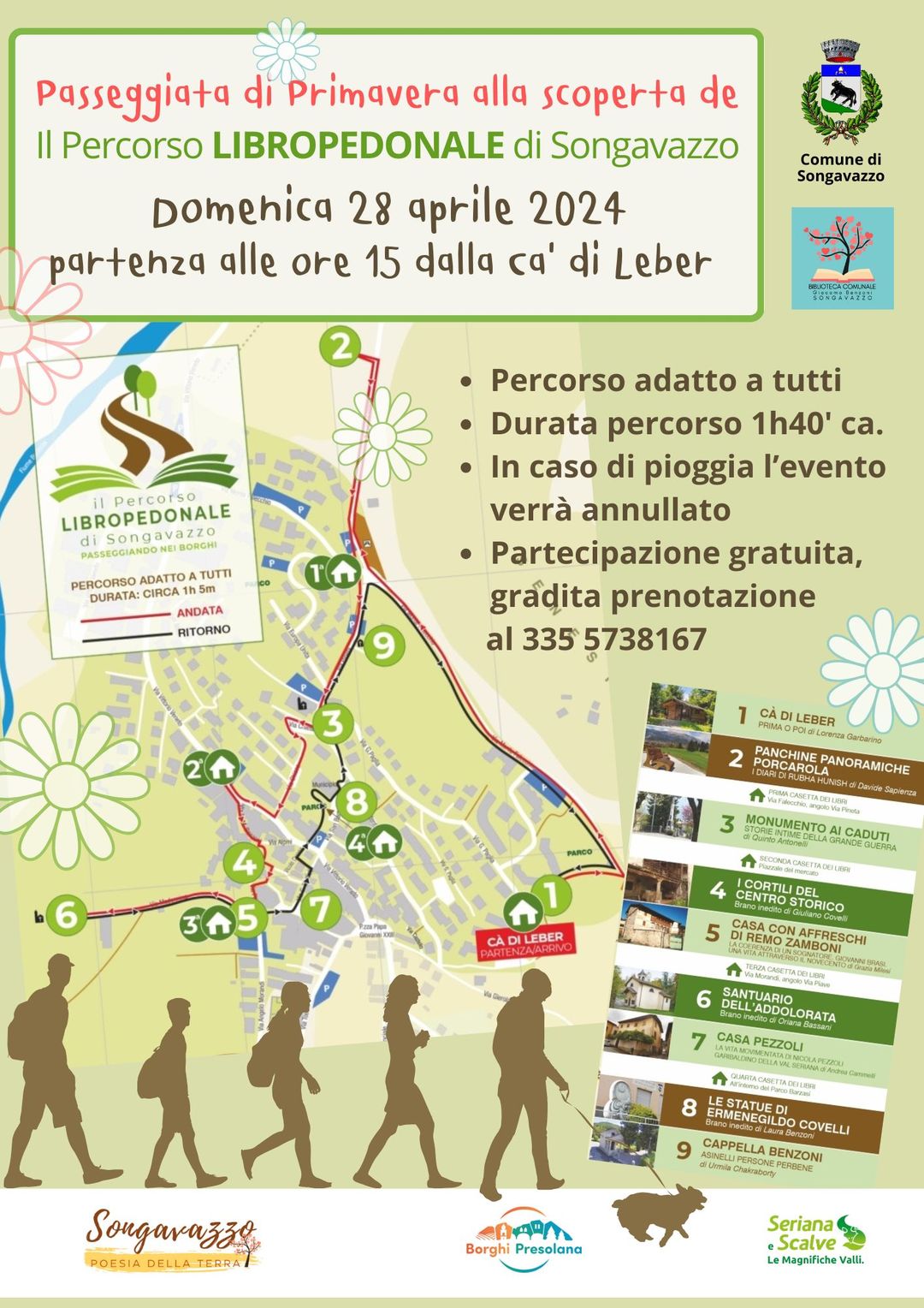 Il Percorso Libropedonale, inaugurato nel maggio del 2022, รจ un cammino turistico - culturale pensato come collegamento fra le varie casette dei libri ai luoghi panoramici e storico - artistici presenti sul territorio di Songavazzo. Il percorso รจ costituito da 9 soste segnalate da 9 pannelli interattivi che accompagnano alla scoperta delle bellezze songavazzesi attraverso brani letterari dedicati al paese con la possibilitร di ascoltarli dalla viva voce degli autori. DOMENICA 28 APRILE 2024 PARTENZA ALLE ORE 15.00 DALLA Cร DI LEBER Lโintero percorso comprese le letture ha una durata di circa 1h40โcirca ed รจ adatto a tutti.