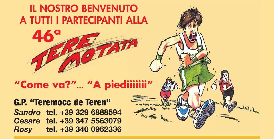 Come ogni anno, il classico saluto "Come va?" troverà la sua risposta più immediata: "A piedi!". Domenica 27 ottobre, la 46esima Teremotata vi aspetta per una giornata all'insegna dello sport e del divertimento.