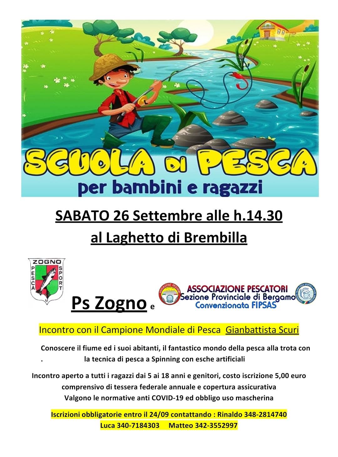 Sabato 26 settembre 2020 ore 14,30 al laghetto di Brembilla, organizzato da pesca Sport Zogno con l’Associazione Pescatori sezione provinciale di Bergamo FIPSAS, si terrà l'incontro con il Campione Mondiale di Pesca GianBattista Scuri, che vi accompagnerà a conoscere il fiume ed i suoi abitanti ed il fantastico mondo della pesca alla trota con la tecnica di pesca a Spinning con esche artificiali.