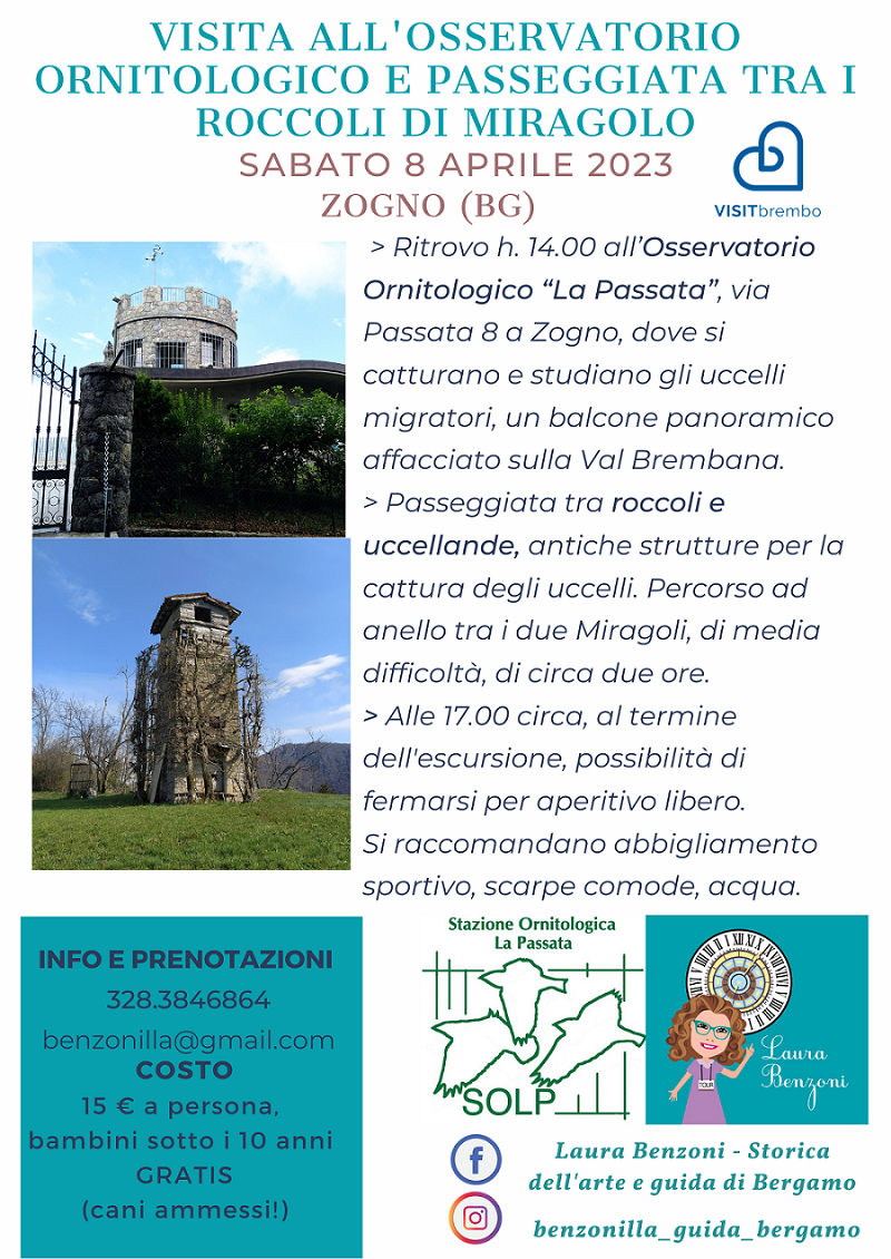 Laura Benzoni, storica d’arte e guida di Bergamo organizza una Visita alla stazione ornitologica “La Passata” e passeggiata tra i roccoli di Miragolo a Zogno.
