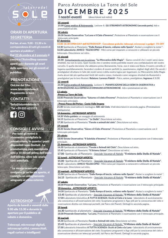 Spettacolo al planetario presso La Torre del Sole: si decollerà dalla terra per un viaggio meraviglioso alla scoperta dei pianeti del nostro Sistema Solare, dove si potrà ammirare il paesaggio e ascoltare interessanti curiosità.